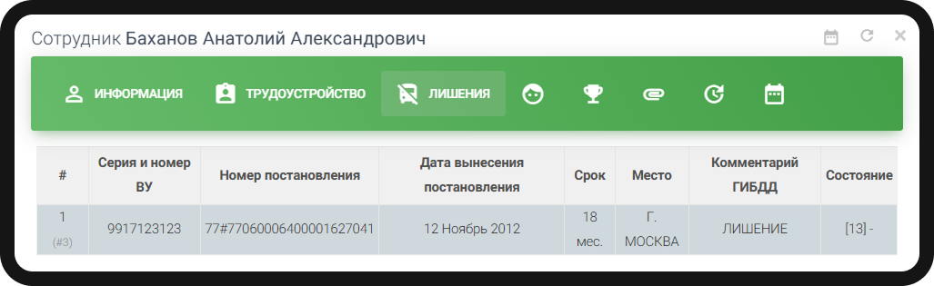 Контролируйте актуальность прав водителей: срок действия и историю лишений. Гарантируйте юридическую чистоту ваших поездок.